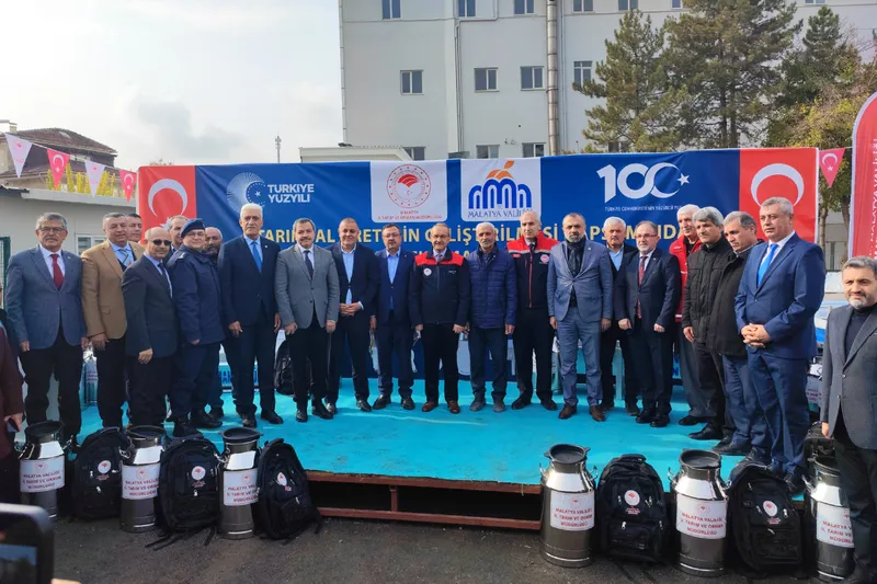 Malatya'da yetiştiricilere destek amacıyla İl Tarım ve Orman Müdürlüğü bahçesinde Çoban Evi (konteyner), akıllı yemlik, metal sıvat, süt güğümü ve buzağı koruyucu malzemeleri dağıtım programı gerçekleştirildi.