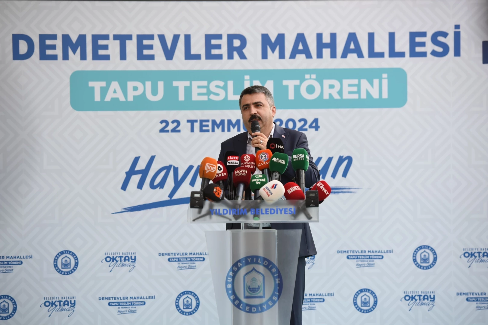 Yıldırım’da görevi devraldıkları 2019 yılından bu yana gerçekleştirdikleri imar ve kentleşme çalışmaları ile birlikte yeni Yıldırım'ı inşa etmeye devam ettiklerini ifade eden Belediye Başkanı Oktay Yılmaz, “Bu bağlamda yasal düzenlemelerden imar uygulamalarına, kentsel dönüşümden yeni sosyal yaşam alanlarının kazandırılmasına kadar birçok noktada proje ve hizmet üretiyoruz. Yıldırım için yaptığımız her işte ince eleyip sık dokuyarak, yıllar sonrasını da hesaba katarak çalışmalar gerçekleştiriyoruz. Bu doğrultuda ‘Doğru Plan-Doğru Uygulama’ prensibimizle kamu kaynaklarını israf etmeden önemli işlere imza atıyoruz. Mülkiyet problemini ortadan kaldıran, özellikle ilçemizde riskli alanlarda yeni ve güvenli yaşamın önünü açan imar ve plan uygulamaları kentimiz için sessiz bir devrimdir. Gerçekleştirilen bu düzenleme sosyal donatı alanları ve ulaşım aksları ile güvenli, modern Yıldırım’ın önünü açacak” dedi.