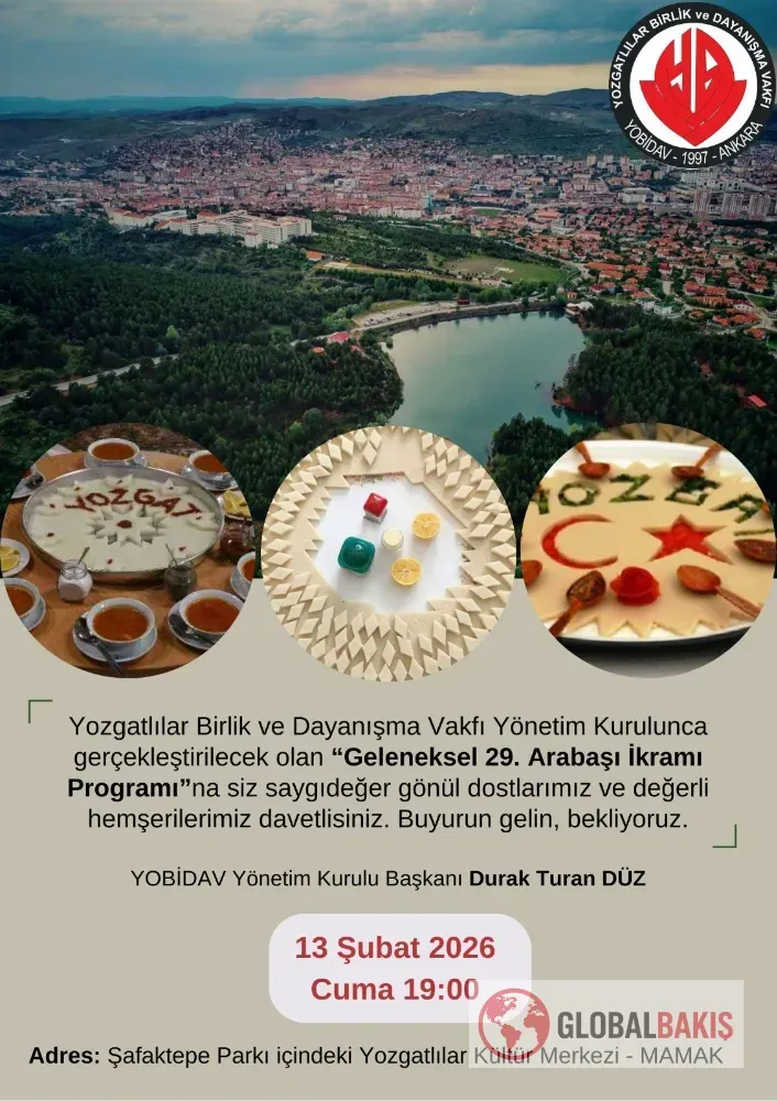 Yozgatlılar Birlik ve Dayanışma Vakfı (YOBİDAV), kültürel değerlerin yaşatılması ve hemşehrilik bağlarının güçlendirilmesi amacıyla düzenlediği Geleneksel Arabaşı İkram Programı’nın 29’uncusuna hazırlanıyor. Uzun yıllardır kesintisiz sürdürülen bu buluşma, Yozgat kültürünün en önemli sembollerinden biri olan arabaşı geleneğini bir kez daha Ankara’da yaşatacak.