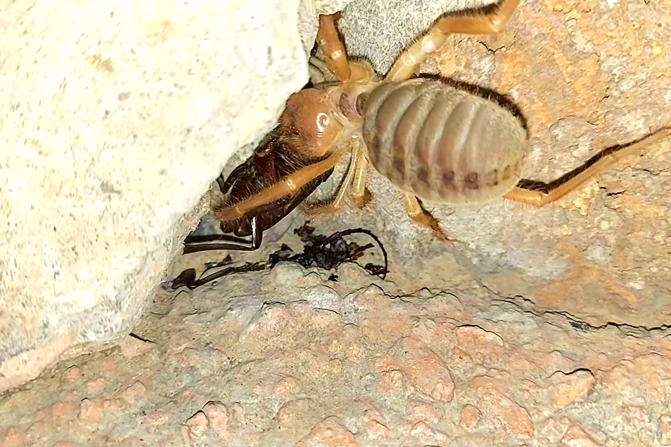 Siirt'in Baykan ilçesinden  et yiyen örümcek olarak da bilinen 'sarıkız örümceği' avladığı böceği yerken görüntülendi.