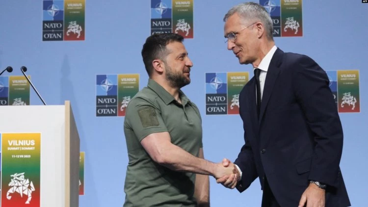 NATO Genel Sekreteri Jens Stoltenberg ve Ukrayna Cumhurbaşkanı Volodimir Zelenski, Litvanya'nın başkenti Vilnius'taki zirve kapsamında ittifakın Ukrayna’ya üyelik davetini şarta bağlamasının ardından kameraların karşısına geçerek, gelişmeleri değerlendirdi. Stoltenberg, Ukrayna’nın süreci tamamladıktan sonra NATO’ya gireceğini açıkladı. Zirveden NATO’ya üyelik daveti alamayan Zelenski de, 'Savaş devam ettiği sürece NATO’ya üye olamayacağımızı biliyoruz' dedi.