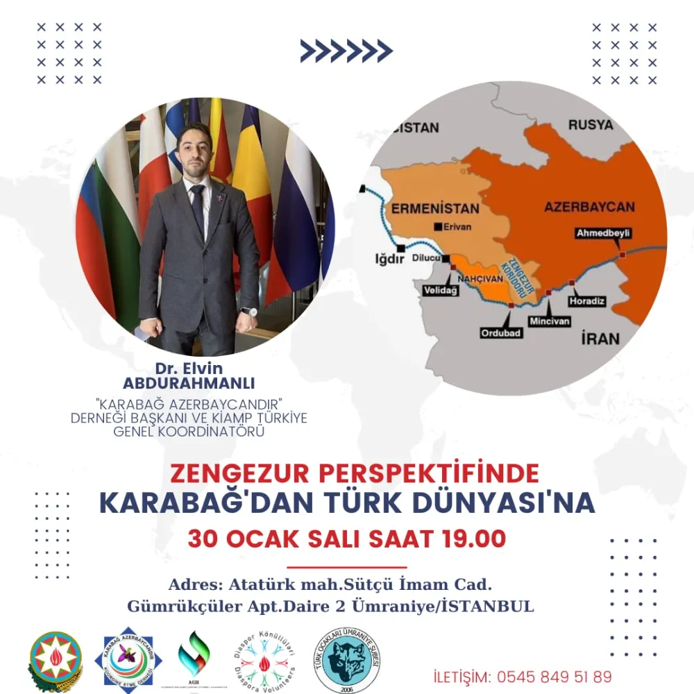 KİAMP-Karabakh is Azerbaijan Milli Platformu T.C Genel Koordinatörlüğü, Türk Ocakları Ümraniye Şubesi, AGİH STP, Diaspora Gönüllüleri isimli kurumların desteğiyle “ZENGEZUR PERSPEKTİFİNDE KARABAĞ’DAN TÜRK DÜNYASINA” isimli Konferans gerçekleştirilecektir.