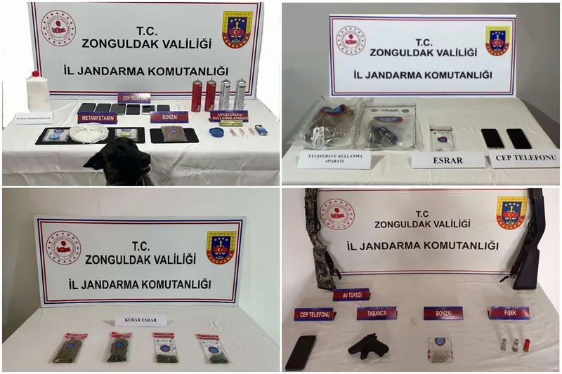 Yapılan aramalarda 429 gram sentetik kannabinoid hammaddesi, 212 gram metamfetamin, 27 gram sentetik kannabinoid, 72,5 gram kubar esrar, 6 adet uyuşturucu kullanma aparatı, 1 adet elektronik sigara, 1 paket sigara sarma kâğıdı, 1 adet esrar öğütme aparatı, 2 adet ruhsatsız av tüfeği ve 1 adet kuru sıkı tabanca ele geçirildi.