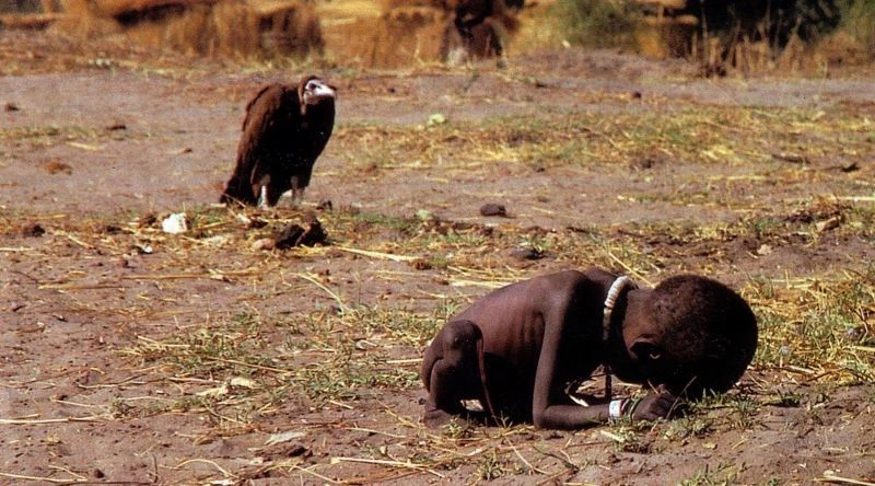 Güney Sudan'da bulunurken, bulunduğu kamptan bir km kadar uzaklaştığında, açlıktan yürümeye dermanı kalmadığından yere çökmüş bir kız çocuğunu ve parçalayıp yemek için ölmesini bekleyen bir akbabayı, yanlarına on metre kadar yaklaşarak aynı karede görüntüledi.